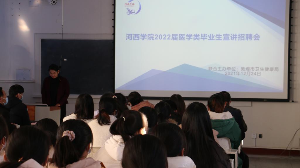 2021年12月24日下午,BETWAY西汉姆联与敦煌市卫生健康局联合,在医学旧校区教学楼举办了2022届毕业生医学类专场宣讲招聘会。此次活动由员工工作部就业办牵头主办,BETWAY必威承办,医公司、护理公司协办。参加此次宣讲招聘会的用人单位有敦煌市卫生健康局、敦煌市医院、敦煌市中医医院、敦煌市妇幼保健院、敦煌市疾病预防控制中心。