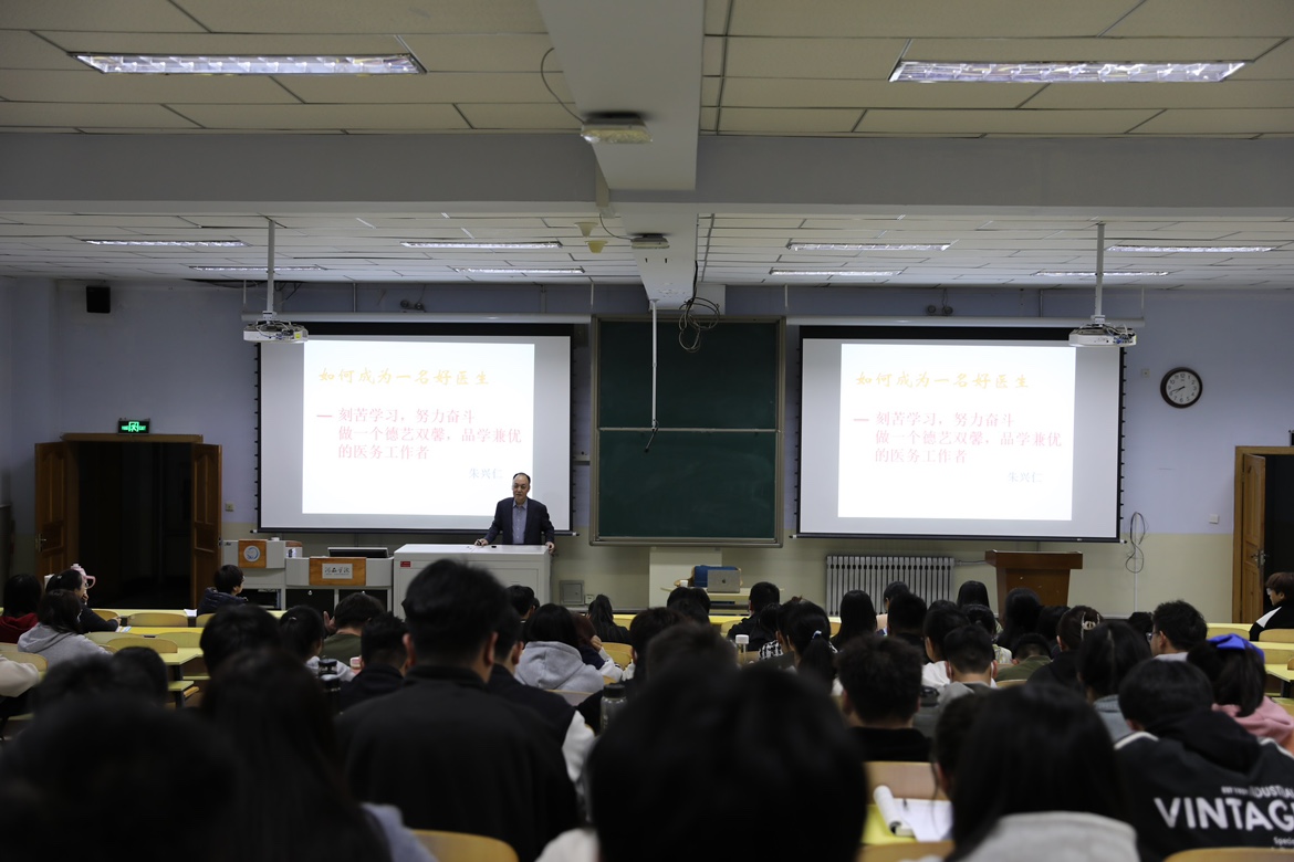 在讲座中,朱兴仁教授从自身从医经历、医生行为准则、医德医范和正确对待医患关系等方面,引经据典,传达了一名“好”的临床医务工作者,应该坚守治病救人、救死扶伤的崇高品质和神圣职责,继承和发扬医疗事业。这次讲座,即是一堂思政教育课,也是老一辈专家在医疗卫生事业的传承课,字里行间透露着老一辈专家对医疗事业的热爱与坚守,也表达了对新时代医学学子的传承与厚望。
