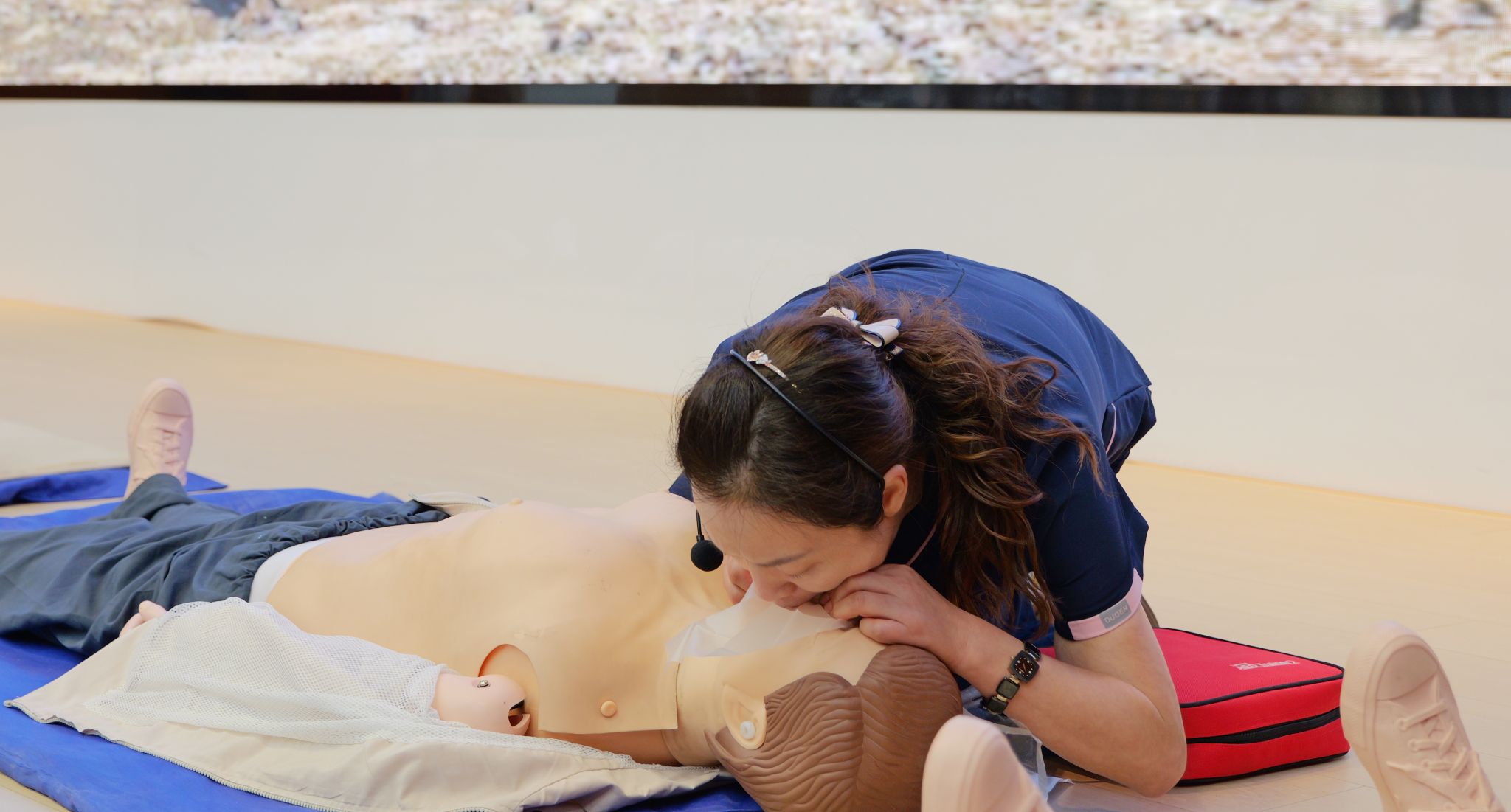 本次培训由公司急救专业团队团队带领“First line急救第一线”社团成员及青年志愿者共同组织实施,聚焦四项核心急救技术——现场心肺复苏术、气道异物清除术、创伤止血包扎固定术及自动体外除颤器(AED)使用,突出实战与应用。教学团队借助高仿真模拟教具及真实急救设备,通过分段演示、手把手教学等方式,帮助员工掌握关键急救流程与操作要领。