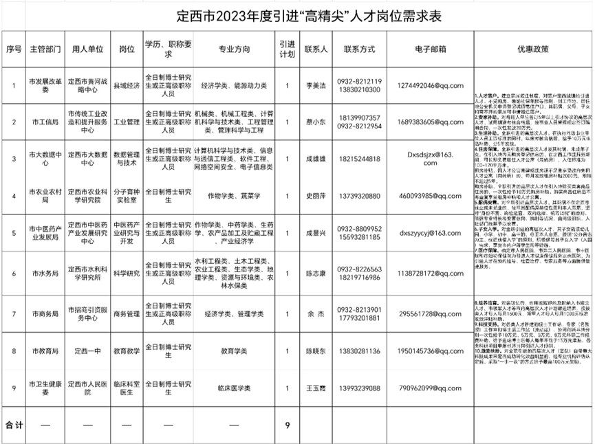 据《关于加强和改进新时代人才工作聚力保障高质量追赶发展的若干措施(试行)》《定西市引进高层次人才和急需紧缺人才实施细则(试行)》等有关规定,现就2023年度引进“高精尖”人才和急需紧缺人才有关事项公告如下:本年度计划引进“高精尖”人才9人,急需紧缺人才283个岗位374人(市直26人、县区348人)。具体岗位详见《定西市2023年度引进“高精尖”人才岗位需求表》、《定西市市直单位2023年度引进急需紧缺人才岗位需求表》、《定西市县区事业单位2023年度引进急需紧缺人才岗位需求表》。